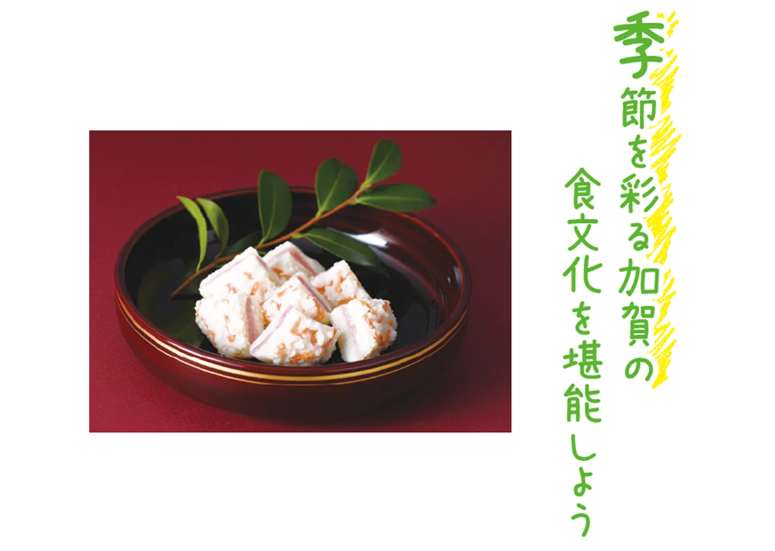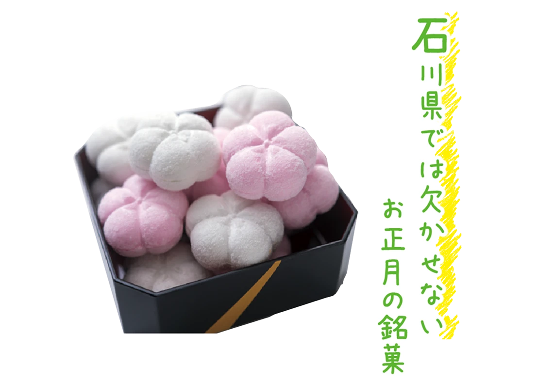 前田家の家紋「剣梅鉢」をモチーフに、藩政時代後期からの歴史を持つ金沢銘菓。期間限定販売で、紅梅白梅をかたどった意匠は、新年をお祝いするお菓子として最適。11月下旬〜1月初旬の販売予定。