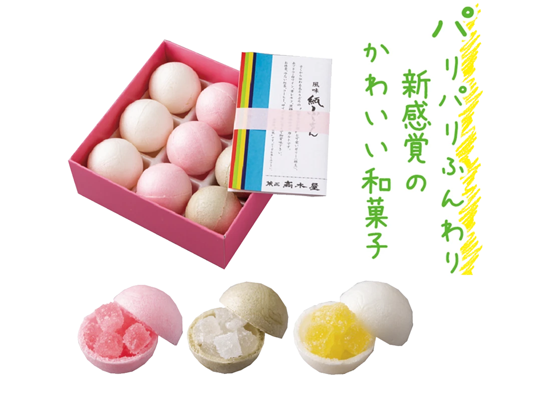 色とりどりのまんまる最中の中に和風ゼリーの錦玉が入ったかわいらしいお菓子。定番のこの3色以外に季節バージョンもある。紙風船が折れる折り紙付き。