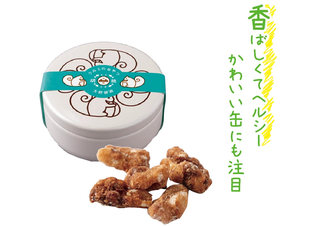 佃煮の老舗が受け継いだ技と、地元金沢の大野醤油を生かして作り上げたおやつ。古くから金沢で珍重されてきたクルミの新しいおいしさを提供。メープル風味もある。