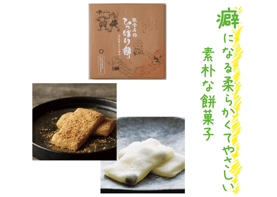 義経逃避行伝説にちなむ能登銘菓。石川県産の米粉で作った餅に甘納豆を散りばめた「白」と、香り高いきな粉をまぶした「きなこ」の2種がある。