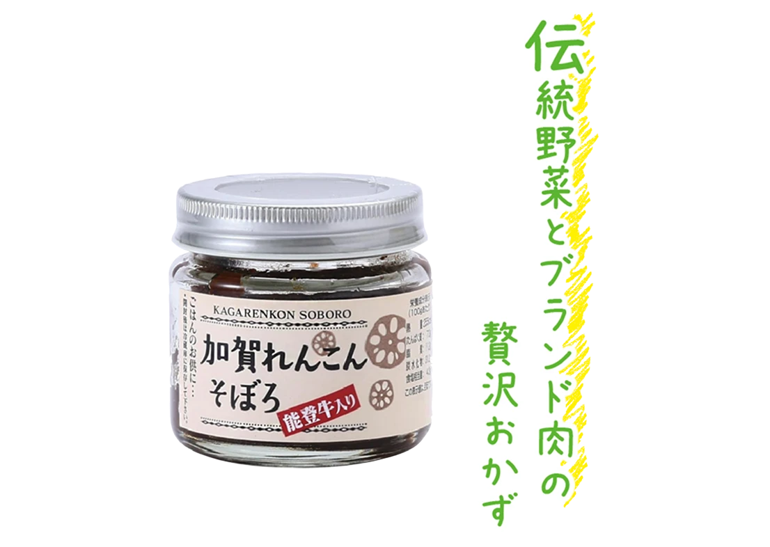 加賀野菜の一つ・加賀レンコンに、タマネギ、ショウガ、能登牛のそぼろを合わせ、地元金沢の大野醤油と能登のいしる(魚醤)でじっくり炊き上げた、食欲をそそる一品。