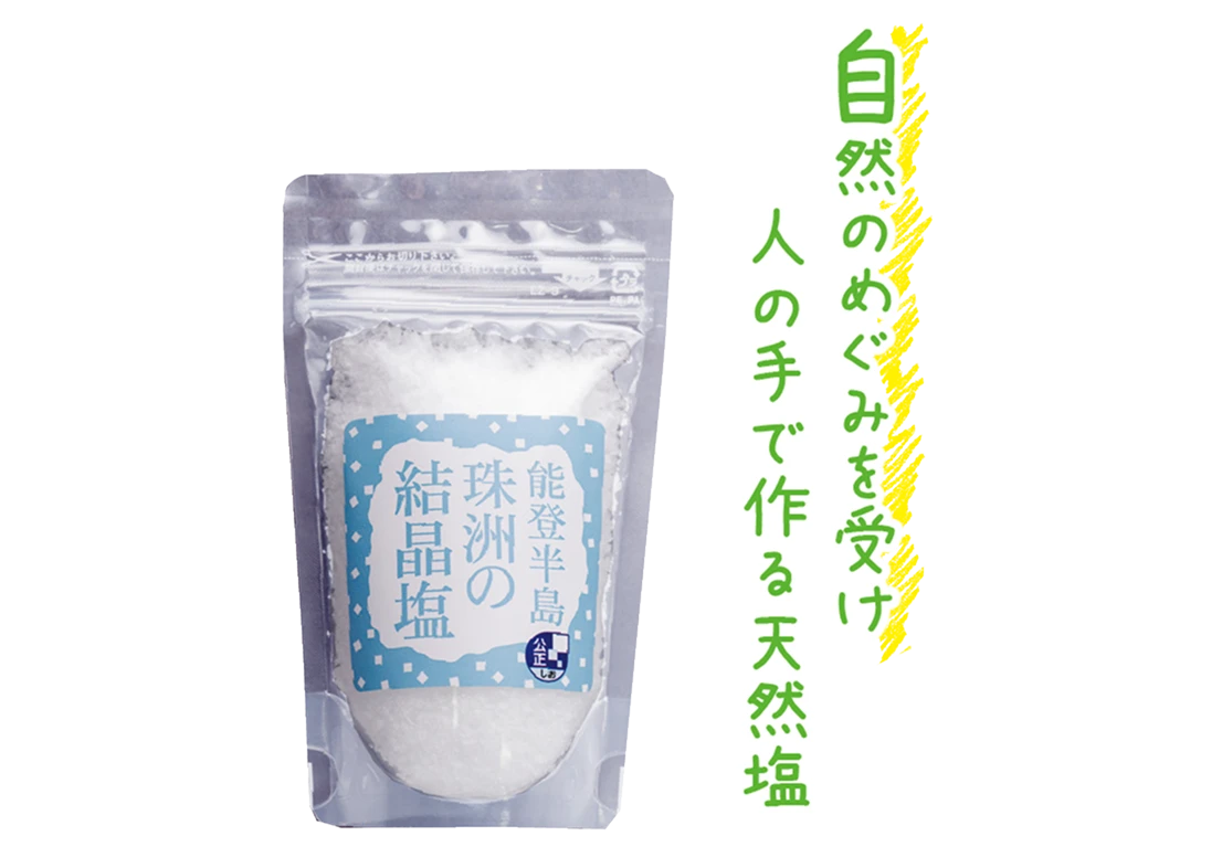能登半島に受け継がれる、天日と平釜で仕上げる伝統の製塩法。震災から復活を遂げ、能登の塩がアンテナショップにも少しずつ入荷されている。写真は味わい深い珠洲の結晶塩。
