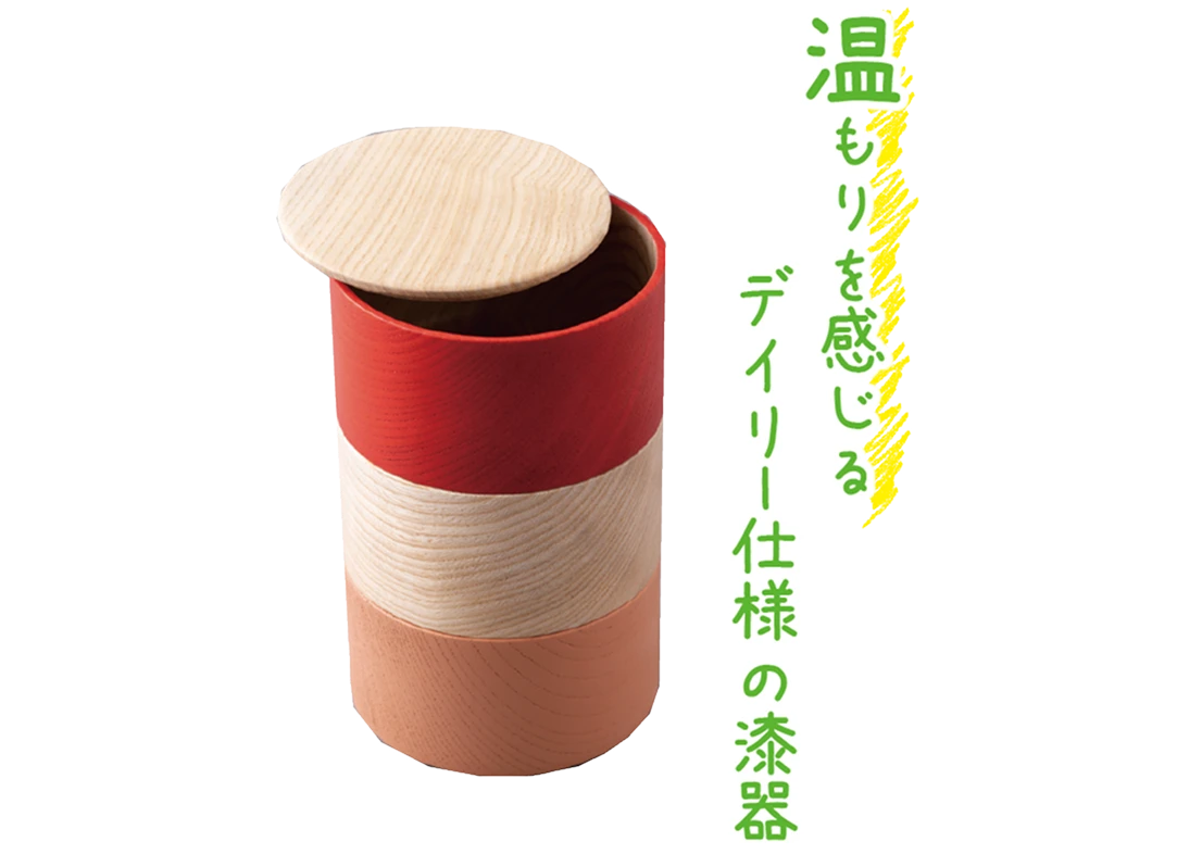 ろくろ挽きでの木地生産量日本一を誇る山中の漆器店が生み出す、モダンな木製キャニスター。おかずやお菓子を入れたり小物を収納したり、使い方いろいろ。色はグリーン、ネイビーなど他にもある。