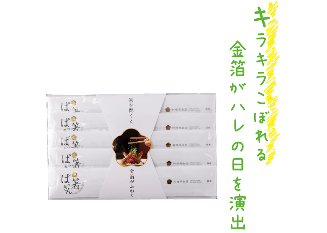 パッキンと箸を開くと、ヒラヒラと金箔が舞う割り箸は、クリスマスやお正月など、年末年始の晴れやかな食卓にぴったり。少人数用の2膳セット648円もある。
