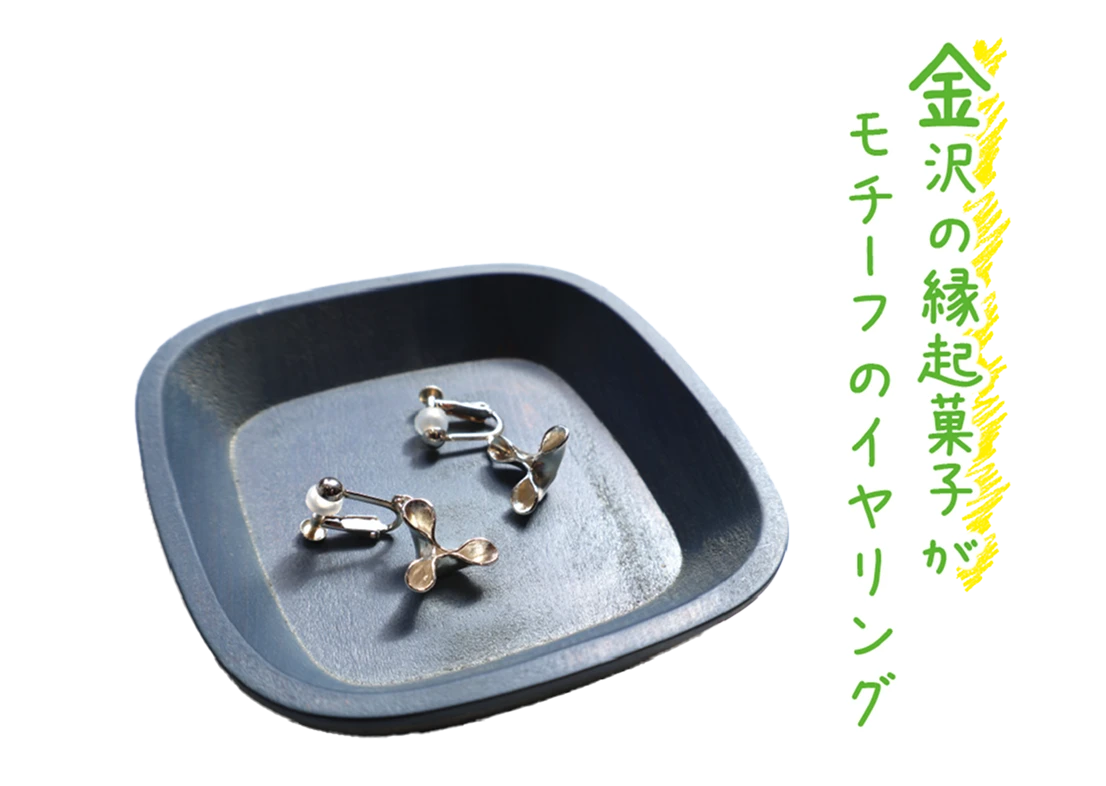 金沢の暮らしで目にする“形”に着目し、制作活動を行う金属工芸家・秋友さんの作品。写真のイヤリングのモチーフは金沢の正月菓子「辻占」で、耳元で揺れる柔らかなフォルムが素敵。ピアスもあり。