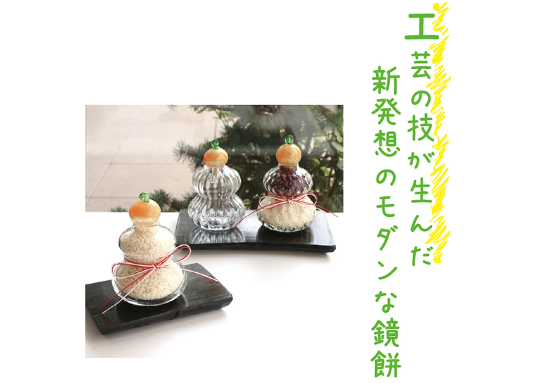 工芸と吹きガラスの技が融合した新発想の器。お正月には米を入れて鏡餅の代わりに、お正月以外は花瓶として使うことも可能。蓋の橙には金沢の金箔を使用。水引付き。