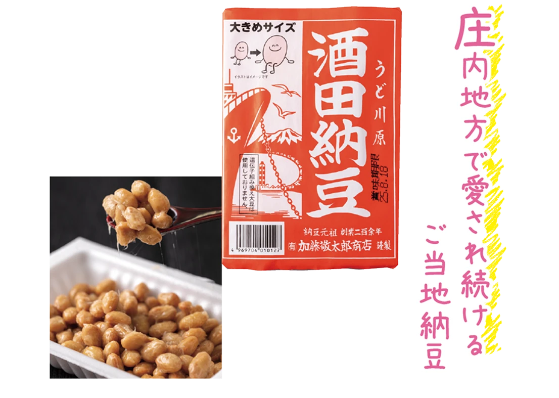 粒が大きくふっくらしているのが特徴。豆本来の風味が感じられる昔ながらの納豆だ。鳥海山、海、船という酒田のシンボルが描かれたパッケージがノスタルジック。