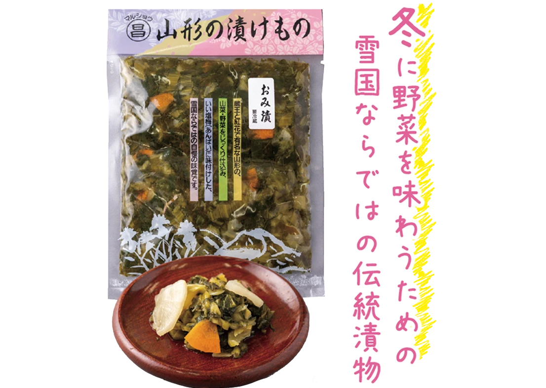 山形特産の山形青菜、大根、人参を刻んで漬け込んだ郷土の味。漬けダレに刻んだスルメを加えてあるのが山形らしい。ご飯はもちろん、納豆や冷や奴、パスタとも好相性。