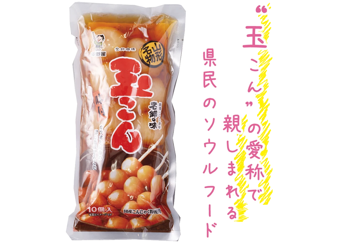 山形の観光地では必ずといっていいほど見かける、屋台の玉こんにゃく。じっくり煮込んでだしを吸った玉こんにゃくは、中まで味が沁みている。冷たくしてもおいしい。