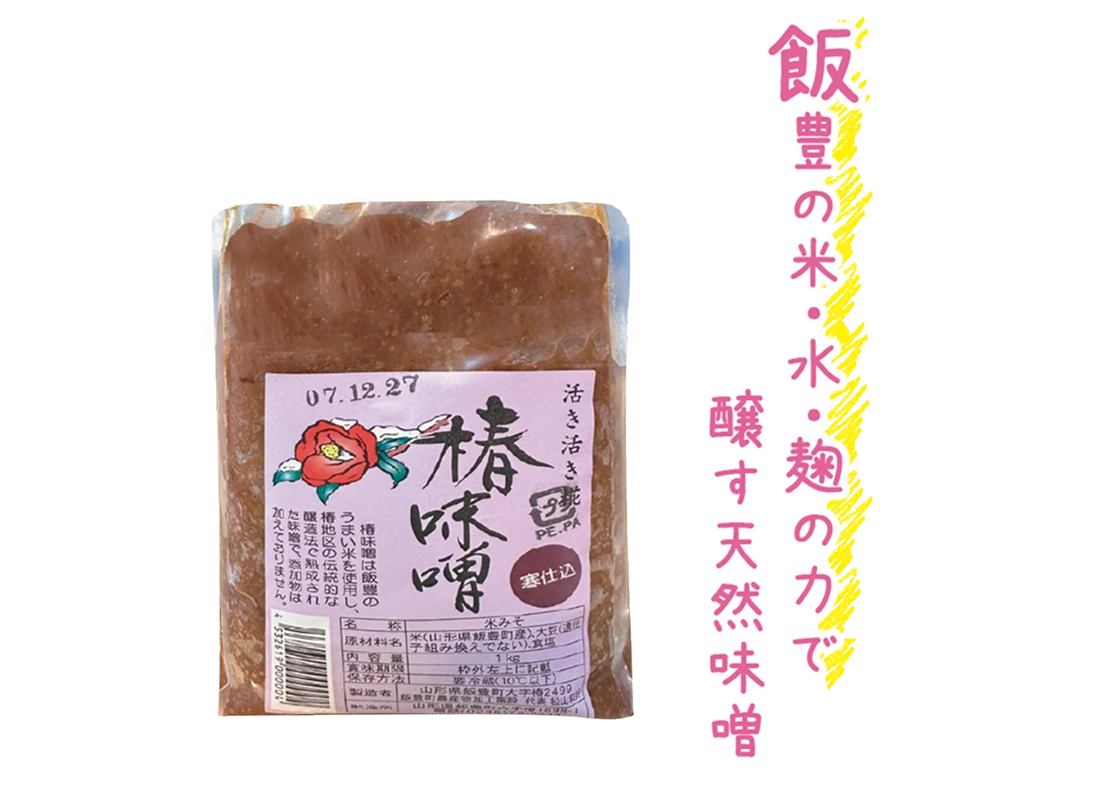 朝日連峰の麓にいだかれる飯豊町椿地区の伝統特産品。化学調味料や添加物を加えず、木製大樽を使い、自然の力で熟成させた昔ながらの天然醸造味噌は、熟成するほど深みが増す。
