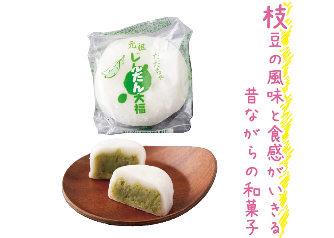 じんだん菓子を作り続ける、老舗自慢の逸品。「じんだん」とはこの店がある置賜地方の方言で枝豆をすりつぶしたずんだ餡。それを包む山形産餅米・ヒメノモチを使った餅もおいしい。