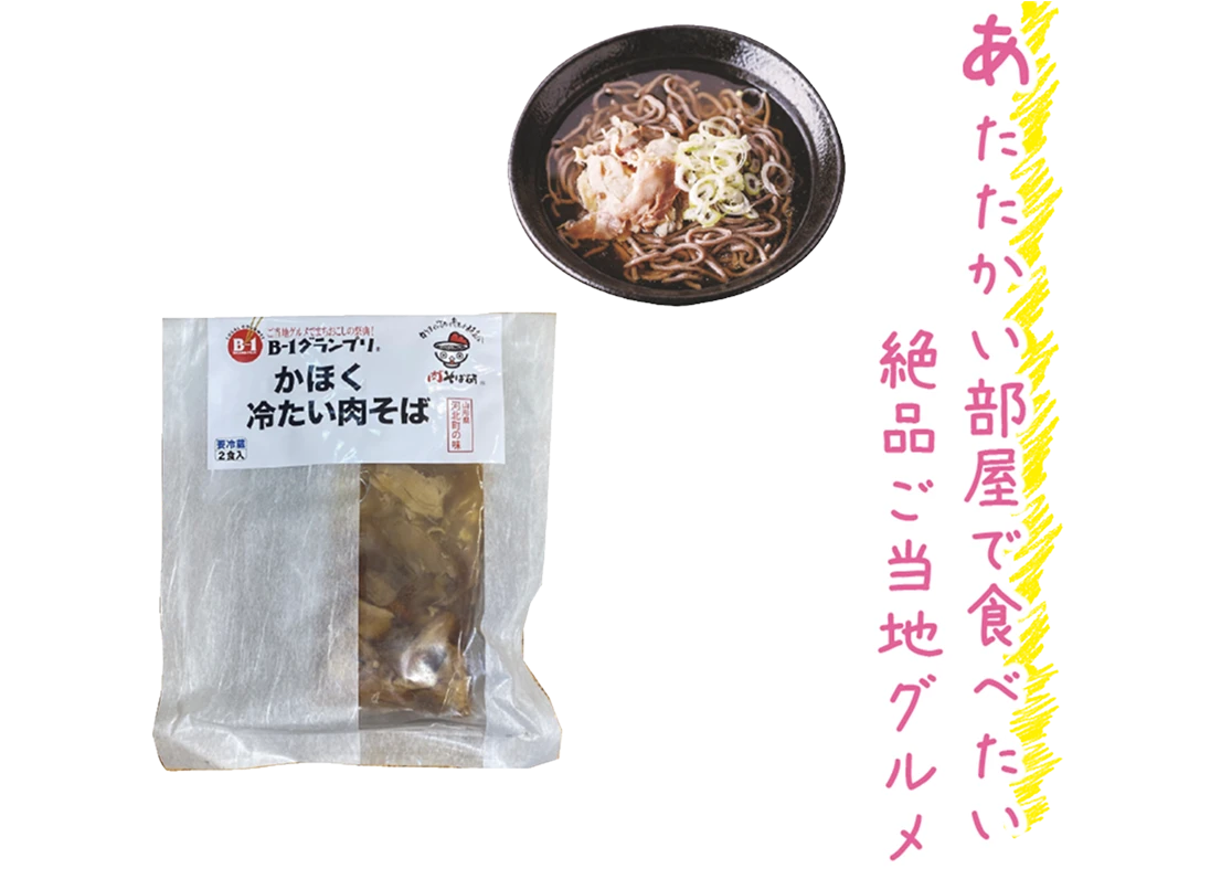 ご当地グルメの祭典「B-1グランプリ®」で入賞経験がある河北町のソウルフード。寒い冬でも“そば”といえば「冷たい肉そば」で、鶏チャーシューと甘じょっぱいつゆが特徴。