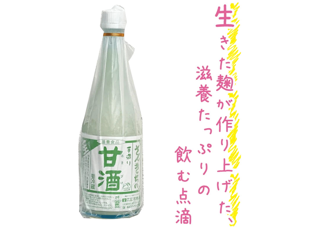 河北町で300年続く麹店が手掛ける伝承製法の甘酒。そのままはもちろん、ショウガを加えたり、牛乳で割ったり、凍らせてもおいしい。賞味期限は冷蔵で4日間。