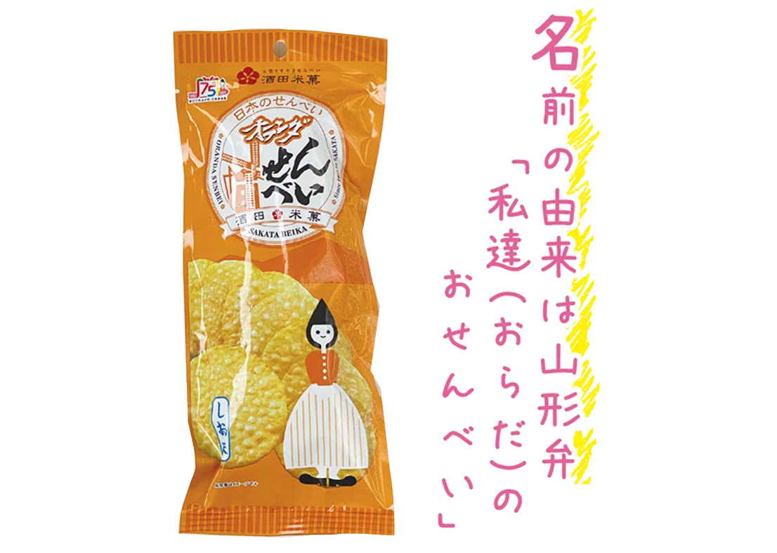 酒田土産の定番で地元民にこよなく愛されている、うす焼きせんべい。昭和37年(1962)の発売以来、年間2億枚を生産している。しお味のほか、味のバリエーションも豊富。