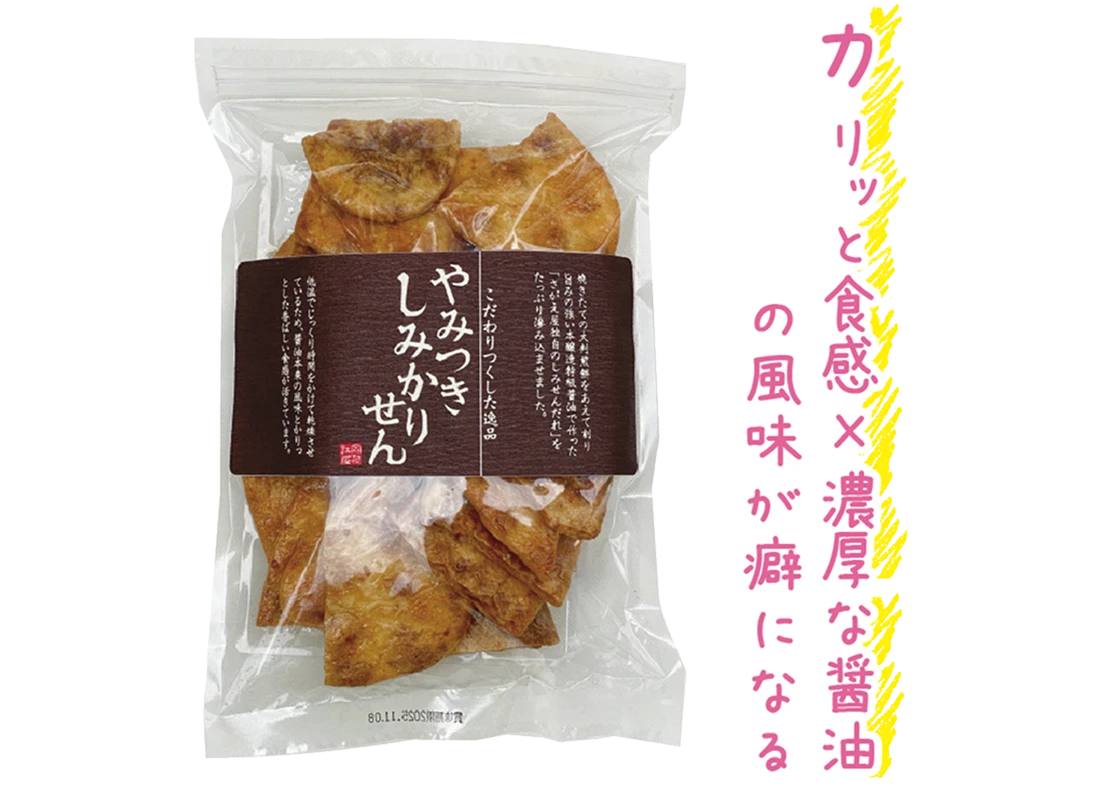 焼き立ての大判煎餅をあえて割って、特製「しみせんだれ」に漬け込んでじっくり乾燥させた、硬くて醤油風味たっぷりの懐かしい味。噛めば噛むほど、タレのうま味が感じられる。