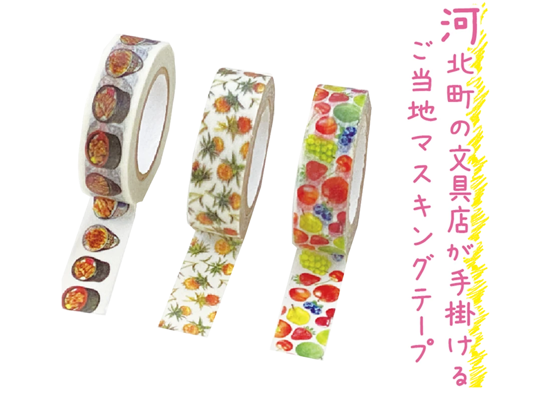 昭和26年(1951)創業以来、町民に親しまれてきた文具店「石山商店」のオリジナル商品。河北特産の紅花や果物のほか、隠れた名物・谷地のカツ丼など楽しいラインナップ。