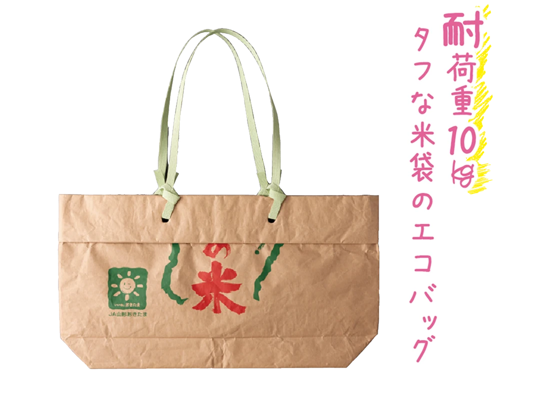 米どころ山形らしいエコバッグ。本物の米袋を利用しているから丈夫で、買い物のほか、野菜の保存袋として使用しても。山形市のスペイン料理店「トランキロ」の手作り。