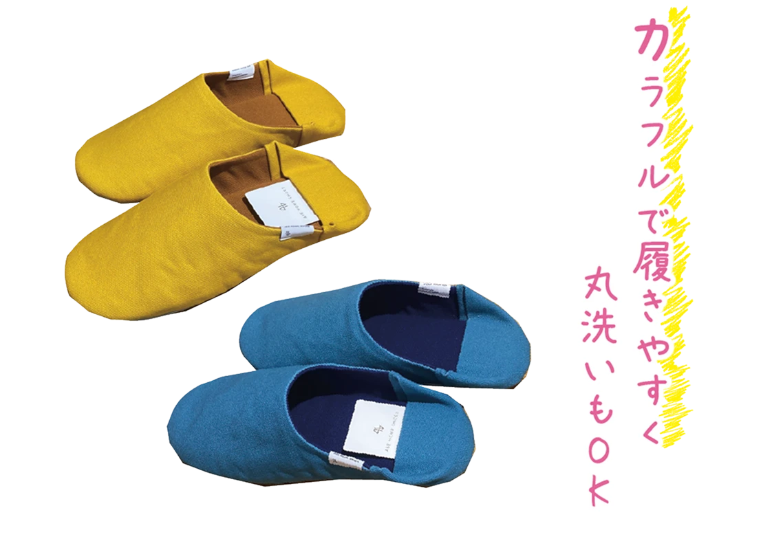 草履製造から始まり、今やスリッパの生産日本一の河北町。その技術を活かした商品が、「ABE HOME SHOES」のホームシューズ。ビビッドカラーで多色展開。草履タイプもある。