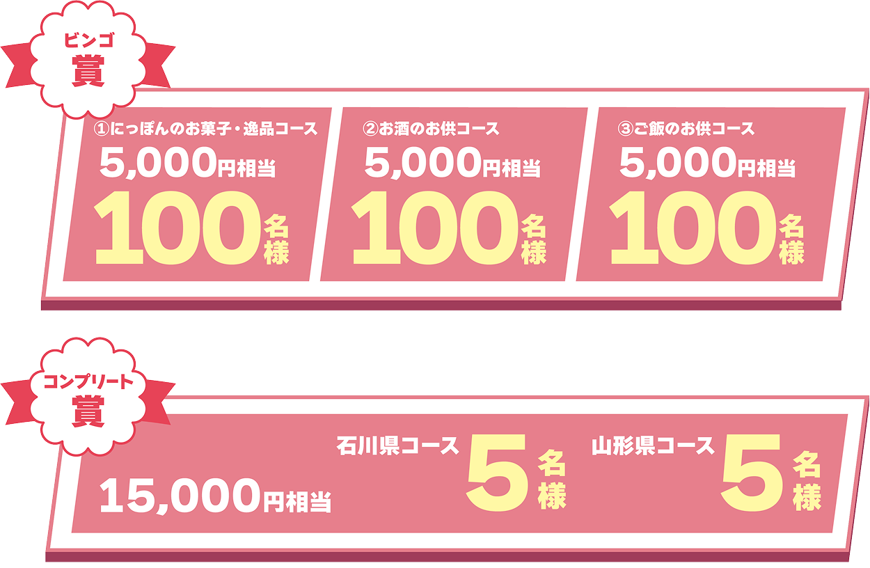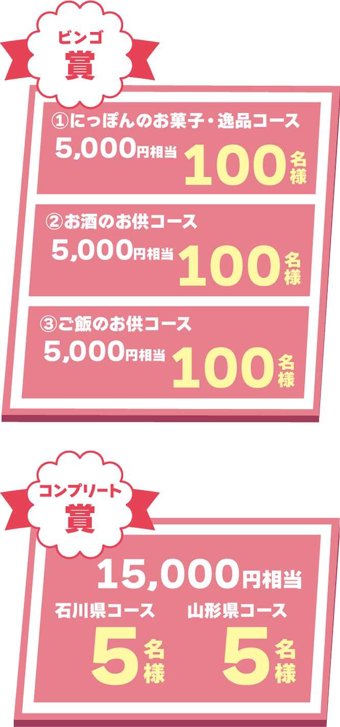●ビンゴ賞の応募は1コースのみとなります。また、ビンゴ賞・コンプリート賞とも各コースの賞品に内容は選べません。