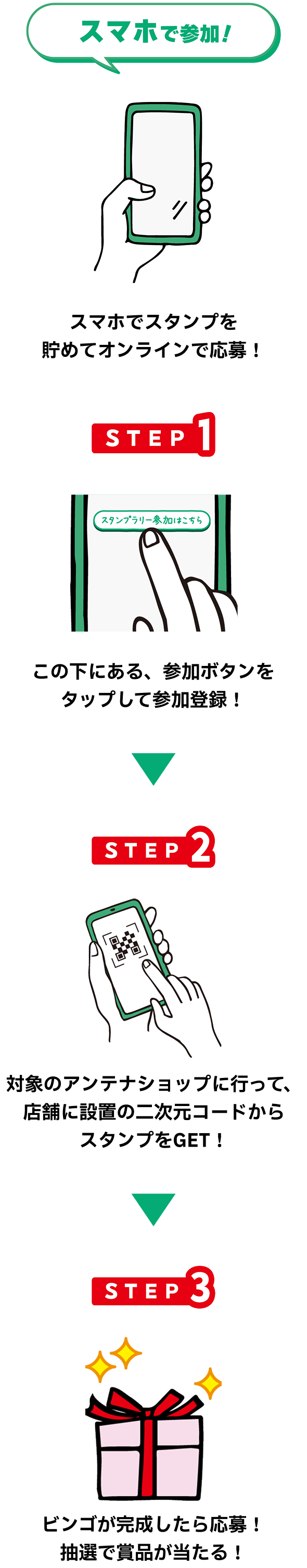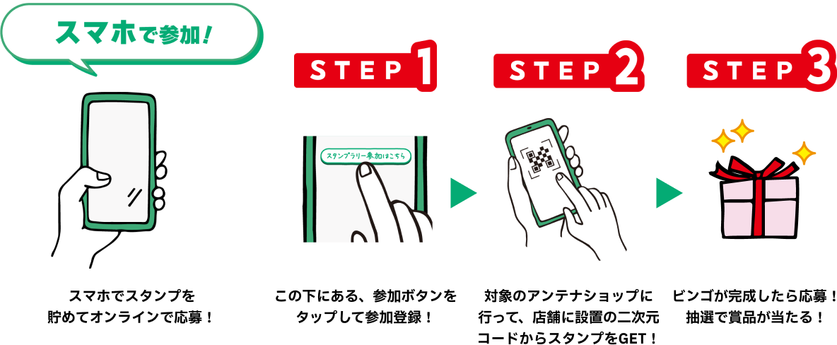 ●スマートフォンでの応募:各賞達成時に応募可能。ビンゴ賞は、応募は1回のみで、応募後達成したビンゴも口数が追加され、12月14日の時点でのビンゴの数が口数となります。